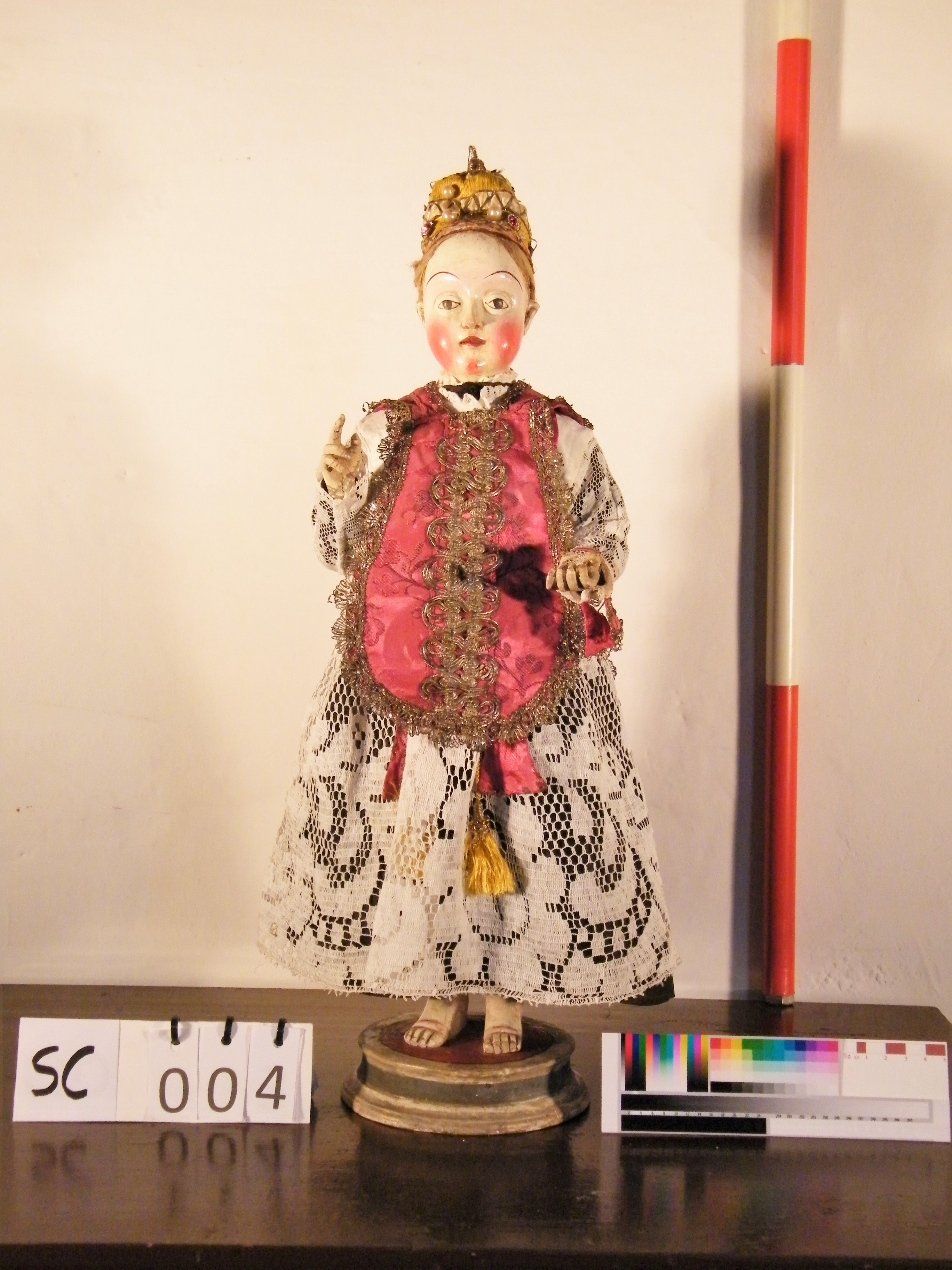 - NOTIZIE STORICO CRITICHE La statuetta, così come appare oggi, raffigura il Bambino Gesù di Praga, solamente mancante del globo e con le vesti che non riproducono fedelmente quelle del vero Bambino di Praga. In realtà la scultura sembra essere più antica, probabilmente risalente al XV secolo. Vista la sua posizione e il fatto che l'intero corpo è scolpito in legno e dipinto, è ipotizzabile che in origine esso apartenesse ad una scultura raffigurante la Madonna con il Bambino. In un secondo momento, esso sarebbe stato posizionato sulla base circolare in legno e trasformato nel Bambino di Praga; è forse in un terzo momento che venne cucita la veste sacerdotale, che ha fatto credere al compilatore dell'inventario patrimoniale del monastero che la scultura raffigurasse un "Santo sacerdote"