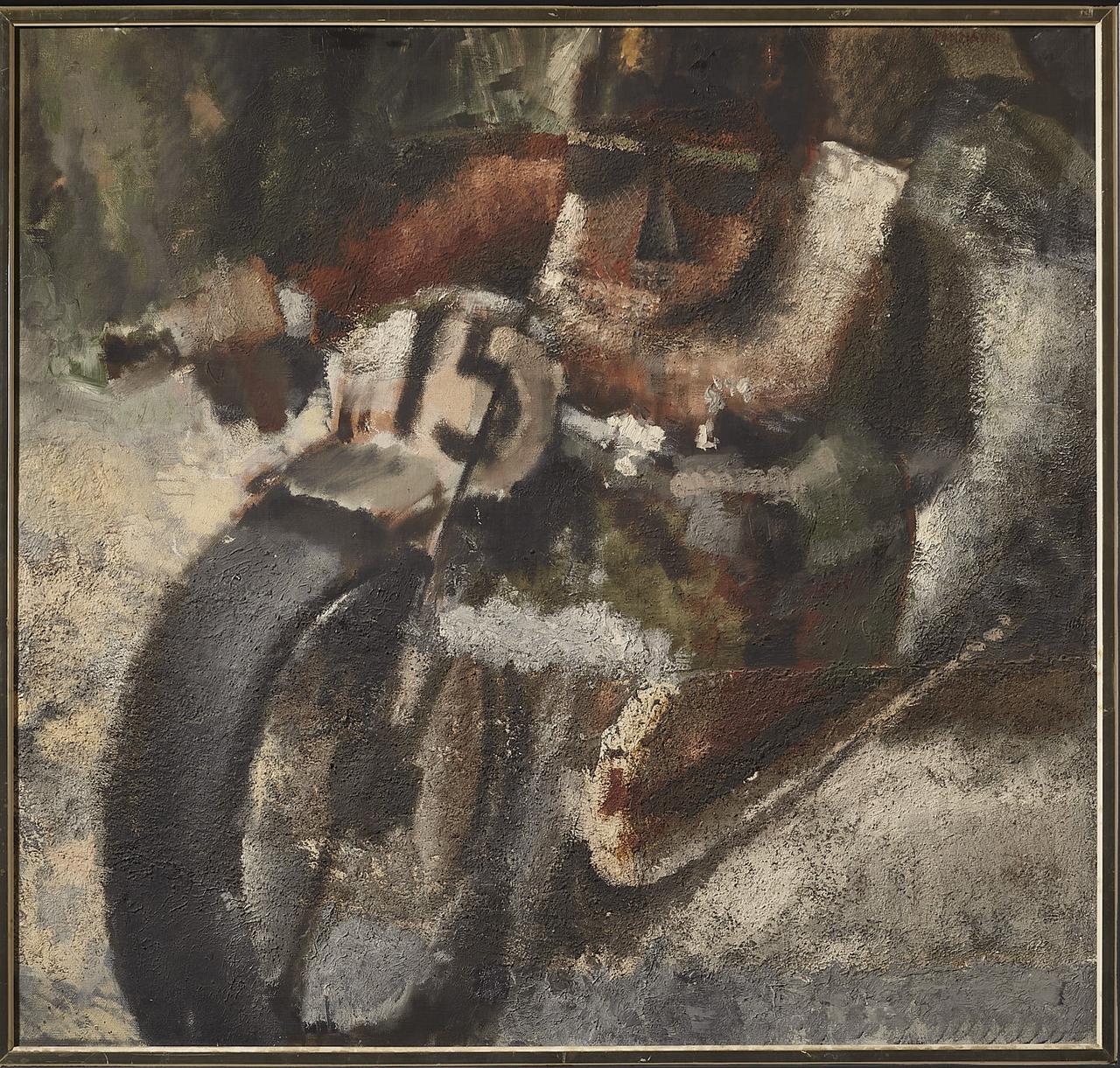 - NOTIZIE STORICO CRITICHE Il dipinto è stato restituito a Kora Pannaggi nel 1980 dal Kunstmuseum di Dusseldorf, dove si trovava in deposito. L'opera è giunta presso la Pinacoteca nel 1996, per volontà degli eredi. L'unica documentazione esistente di quest'opera è costituita da due immagini fotografiche, che riproducono Pannaggi nel suo studio di Dusseldorf e sulla parete di fondo si scorge il Motociclista
