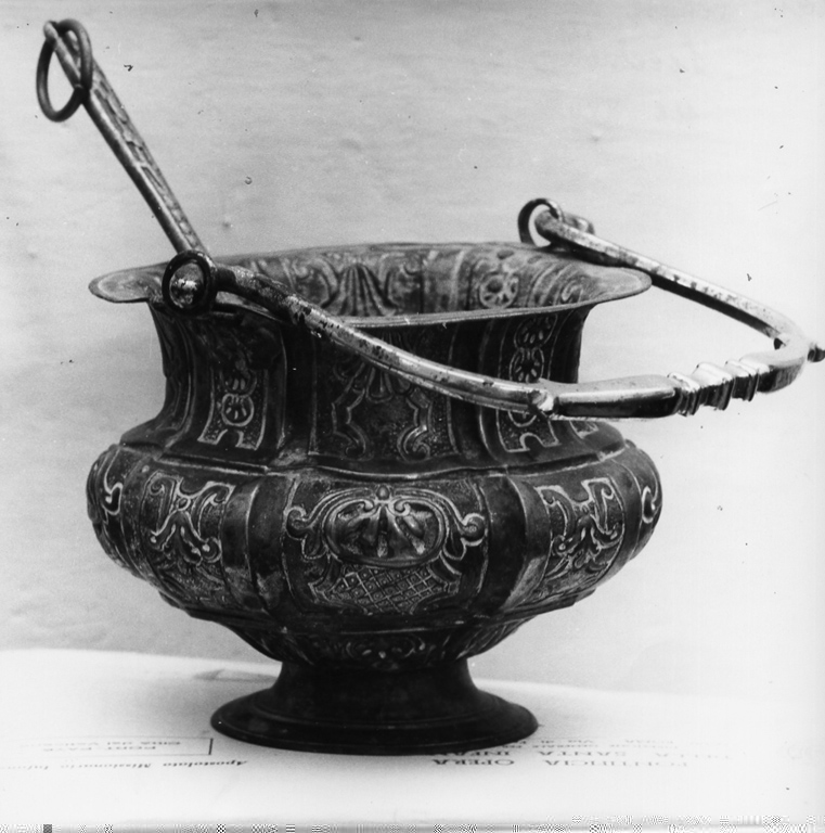 secchiello con piede circolare svasato corpo svasato e bocca con labbro svasato; decorazione geomatrica a volute divisa orizzontalmente in tre fasce