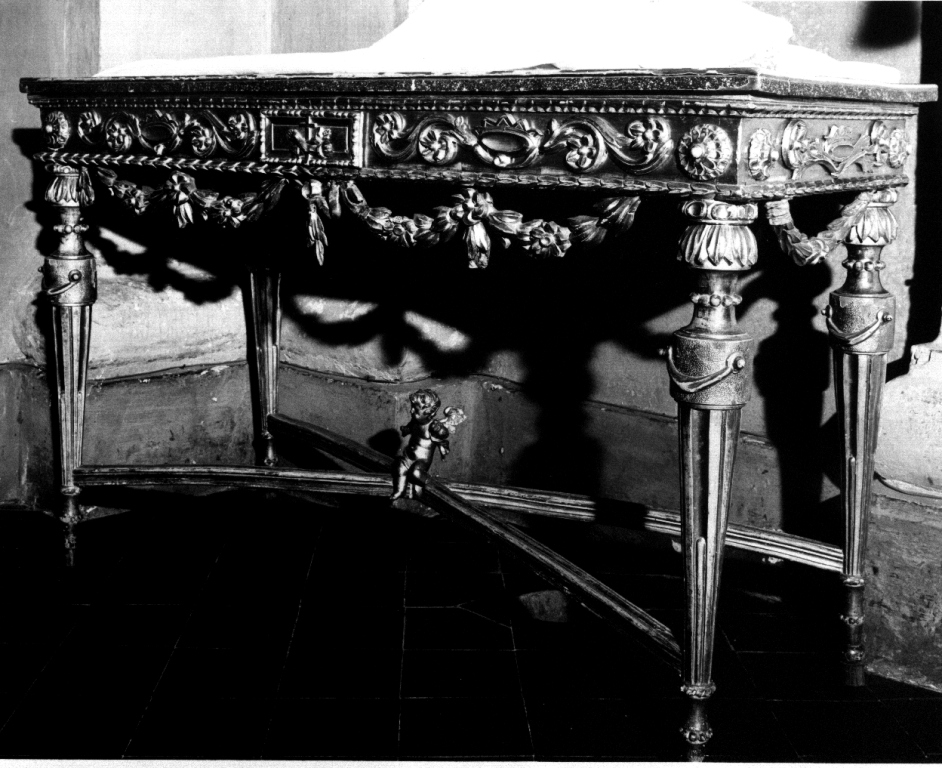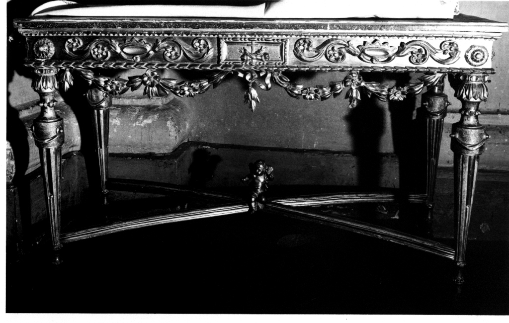 Console a quattro piedi con assi di raccordo sull cui incrocio siede un putto alato. Le decorazioni sono a festoni, ghirlande, corone, fiori, volute e al centro della fronte del piano di appoggio vi è uno stemma