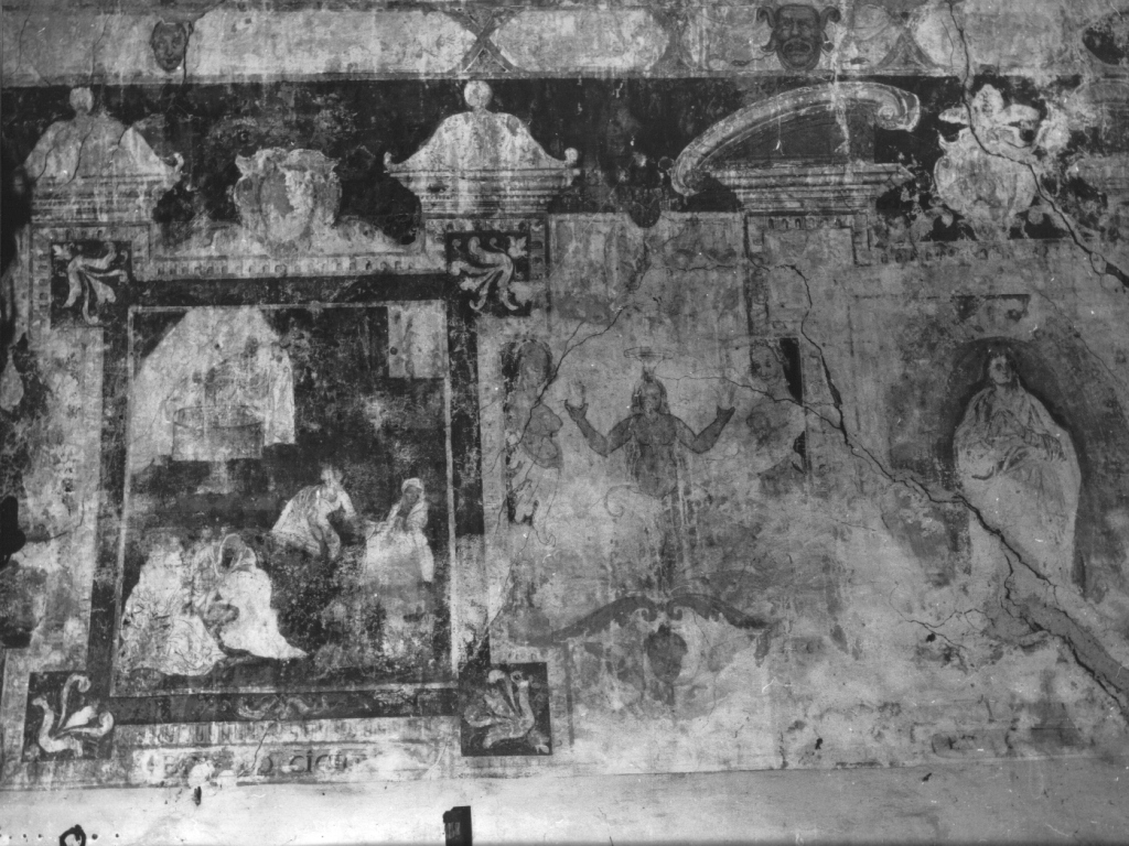 - NOTIZIE STORICO CRITICHE Lo stile degli affreschi presenta caratteri affini al manierismo romano e alla scuola degli Zuccari. L'iscrizione dataria sulla finestra fornisce l'ante quem. Nelle cornici e fra le grottesche sono inseriti i nomi dei confratelli della congregazione, che hanno commissionato i dipinti. Il soggetto della scena non è indicato sulla scheda
