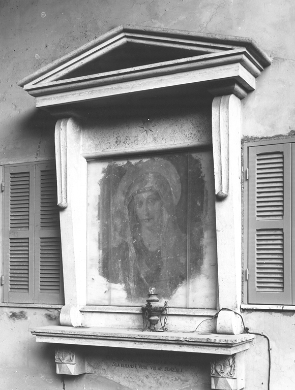 immagine della Vergine inserita in un’edicola sormontata da un frontone triangolare e sorretta da due mensole ornate da teste a bassorilievo