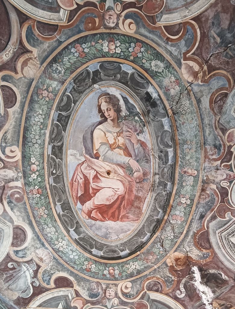 allegoria della Concordia entro cornice ovale decorata a festoni con fiori e frutti; lateralmente, al centro, quattro cartigli entro volute sormontate da teste di cherubini