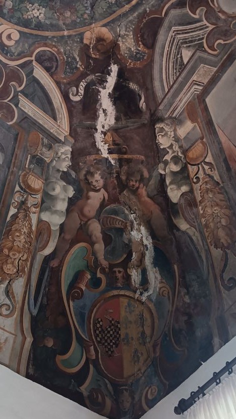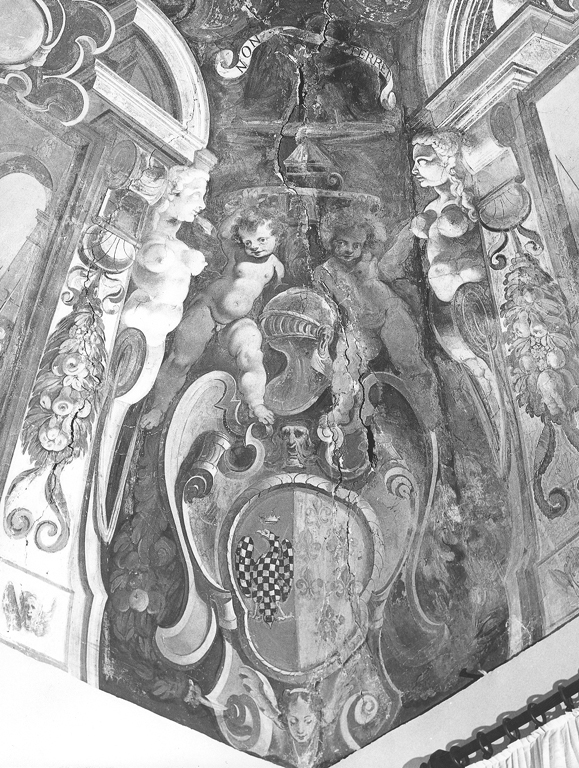 entro uno scudo è lo stemma bipartito Conti / Farnese, in alto due putti, ai lati di un elmo, sorreggono un cerchio d'oro con al centro una lucerna; in alto è un'aquila, poco leggibile, con cartiglio