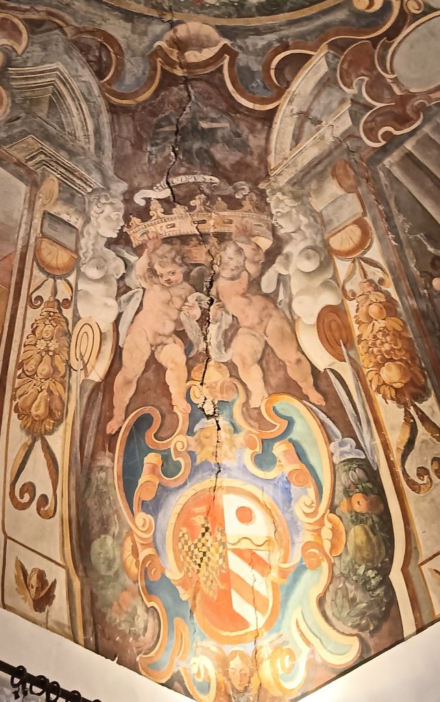 stemma bipartito Conti / Orsini, in alto due angeli reggicorona con sopra un cartiglio e un'aquila