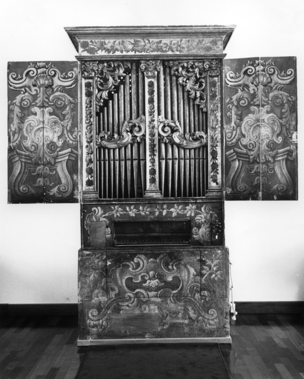 organo racchiuso in cassa a due scomparti con capitelli e intagli, dipinta con motivi floreali; davanti al prospetto due sportelli articolati; canne di facciata divise in due campate che insieme formano una cuspide, bocche allineate e labbro superiore a mitra