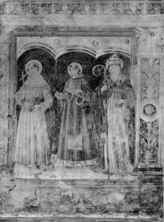 Personaggi: San Francesco d'Assisi; San Leonardo; San Silvestro papa. Attributi: (San Francesco d'Assisi) stimmate e crocefisso; (San Leonardo) manette; (San Silvestro papa) abbigliamento papale. Oggetti: libri. Simboli del martirio: palma