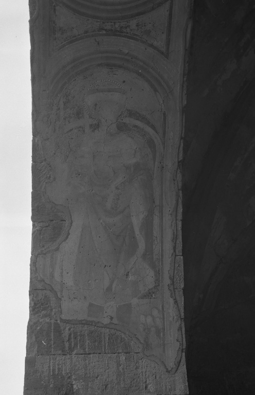In alto al centro in un tondo Cristo benedicente; ai lati sotto due archi due Santi martiri in abiti panneggiati (quello di destra è mutilo nella parte inferiore)