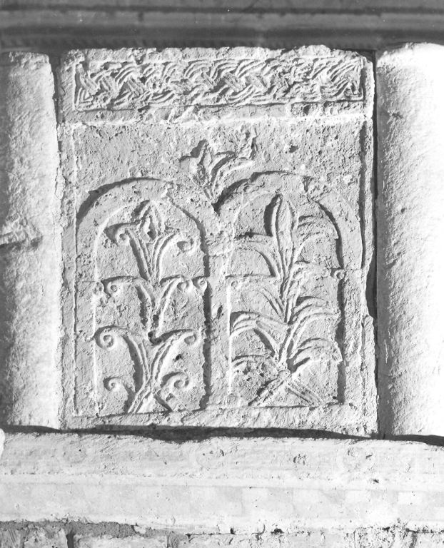 Lastra delimitata da bordi aggettanti lisci. Decorazione: in basso, due archetti, separati da apice gigliato, su tre colonne con capitelli a volute contengono due alberelli di cui quello a sinistra con le foglie terminanti in ricci, quello a destra solo ad elementi vegetali realizzati da nastro bisolcato; in alto, treccia a tre nastri bisolcati