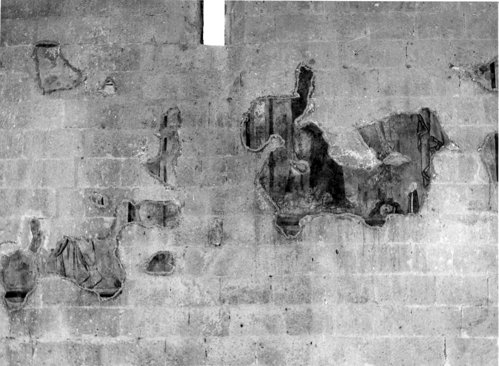 Perlopiù illegibili, si distinduono delle vesti e parti della cornice a decorazioni fitomorfe che profila il campo