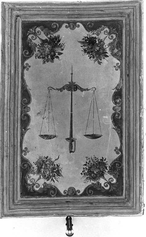 Una bilancia dorata, sorretta da una spada, si staglia contro un fondo di cielo, incorniciata da una decorazione con mazzi di fiori variopinti. L'affresco è iquadrato in una cornice a stucco con fasce lisce