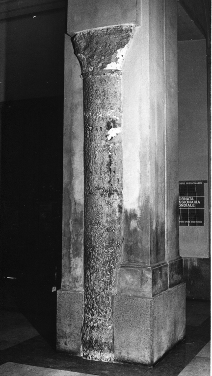 - NOTIZIE STORICO CRITICHE Il capitello aveva foglie angolari arricciate verso l'esterno e una base quadrangolare con toro liscio. Tra il 1758 e il 1760 le colonne furono scalpellate per essere meglio comprese nella struttura dei nuovi pilastri. La demolizione fu evitata per problemi economici