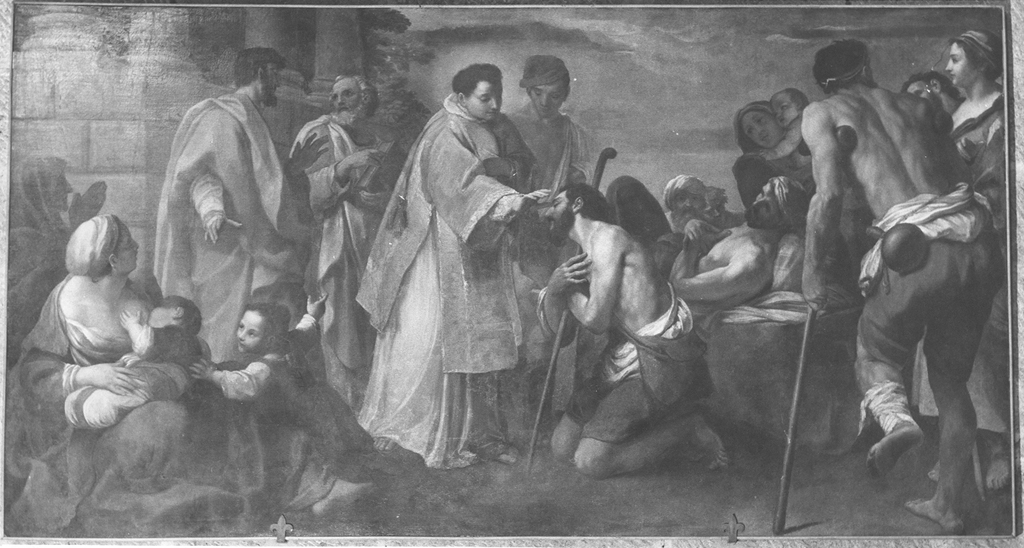 - NOTIZIE STORICO CRITICHE Il dipinto fa parte di una serie di dieci tele poste inizialmente sotto le finestre della navata centrale e quella, di proporzioni maggiori, collocata sulla facciata interna al di sopra del portale, raffiguranti diversi fatti della vita dei Santi Lorenzo, Stefano, Giovanni Battista, Rosa. Esse andarono distrutte durante i bombardamenti dell'ultima guerra (1943-44), eccetto poche. Alcuni anni addietro (1966), la Cassa di Risparmio della Provincia di Viterbo ha acquistato i relativi bozzetti preparatori. Su uno di questi (Santa Rosa da Viterbo tra le fiamme) compare lo stemma di Adriano Sermattei, vescovo di Viterbo dal 1719 al 1731. Le tele furono, dunque, commissionate intorno alla metà del terzo decennio del XVIII secolo. Un confronto con altre tele di Benefial di questo periodo, convince maggiormente ad indicare una data fra il 1725 ed il 1727. La Paolini (M.G. Paolini, Quattro tele del Benefial a Monreale, in "Paragone" XVI, 1965, pp. 71 ss., nota 8), seguita dalla Borea ( E. Borea, in Dizionario Biografico degli Italiani, Roma 1966, p. 467), indica il dipinto come San Lorenzo che distribuisce i beni della chiesa ritenendolo ipoteticamente porzione del quadro originariamente sul muro d'ingresso. Ipotesi indubbiamente errata, anche se il bozzetto relativo al San Lorenzo che distribuisce i beni (Viterbo, Museo Civico) presenta una composizione piuttosto analoga, soprattutto nella disposizione e tipologia di alcuni personaggi (per la foto: A.M. Clark, Manners and methods of Benefial, in "Paragone", XVII, 1966, n. 119, p. 27, nota 8). Il bozzetto relativo al dipinto in questione (Viterbo, Museo Civico) mostra qualità pittoriche che si possono facilmente paragonare ai modi tipici di Benedetto Luti o, comunque, richiama la pittura veneziana del '600 e dei primi del '700. Il dipinto presente in chiesa, inveve, è più raffinato nel colore e composto nell'insieme, secondo quanto si conveniva alla veste pubblica del quadro; da un punto di vista compositivo mantiene rapporti piuttosto evidenti con la produzione del Sacchi, o comunque di una cultura bolognese, mediata al Benefial dalle giovanili acquisizioni del linguaggio marattesco. Recentemente il dipinto è stato indicato dal Faldi come San Lorenzo guarisce gli ammalati (Restauri ed acquisizioni al patrimonio artistico di Viterbo, Viterbo 1972, p. 18. n.5). Si consulti: F. Noack, in Thieme Becker, Kunstler Lexicon, III, Leipzig 1909, p. 322; F. Noack, Marco Benefial ein Bahnbrecher des Klassizimus, in "Monatshefte fur Kunstkwissenschaft", XII, 1919, p. 126; A. Scriattoli, Viterbo nei suoi monumenti, Roma 1915-20, p. 137; I. Faldi, Il Museo Civico di Viterbo, Viterbo 1953