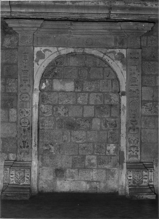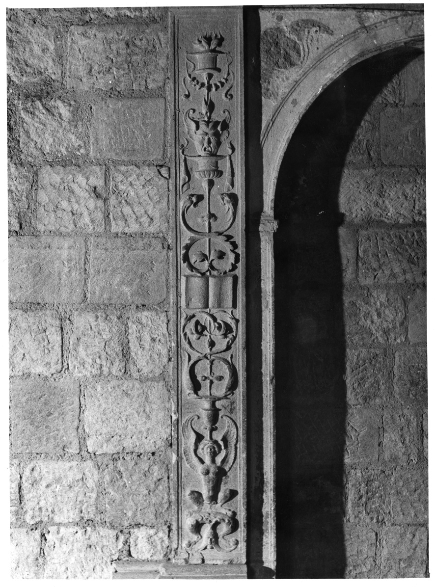 Portale dalle linee essenziali. Gli stipiti sono ornati di candelabre, figure arboree e maschere convenzionali, in un insieme compositivo a grottesche