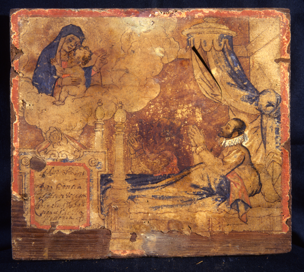 Un infermo giace a letto mentre una donna accanto a lui invoca la Madonna della Quercia che appare in alto a sinistra