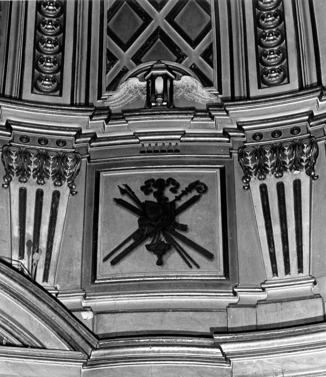 Pannello rappresentante: un antifonario, una mitria, due candele, una lancia, uno spegnitoio, un pastorale, un turibolo
