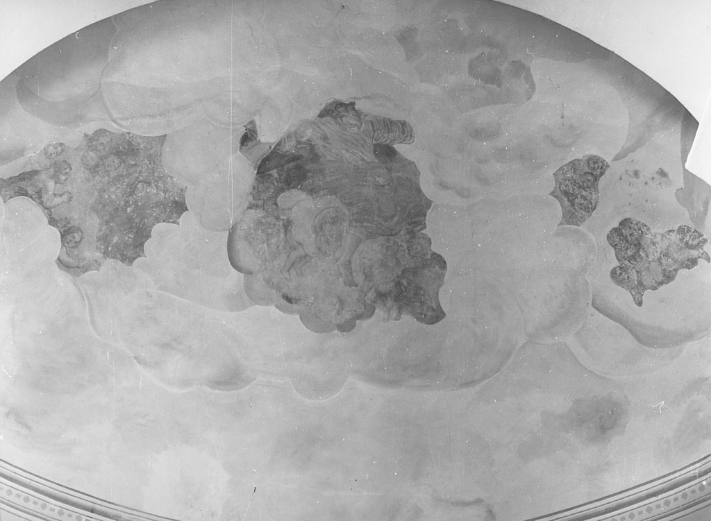 Nel catino absidale si intravedono, frammischiati a ridipinture recenti, frammenti del precedente affresco con il Padre Eterno con una gloria di angeli