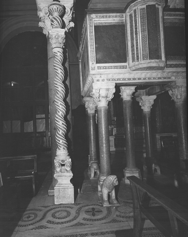 - NOTIZIE STORICO CRITICHE L'ambone in genere è ritenuto contemporaneo al candelabro e messo in relazione con le opere campane, soprattutto con la'mbone di Sessa Aururnca. Per una profonda differenza qualitativa G. Matthiae esclude tuttavia l'attribuzione a Giovanni di Nicola, pur rilevando le affinità con le opere di Fondi e di Minturno. (M.R. De La Blanchere: Terracina. Essay d'histoire locale, Paris 1884, p. 179; M. Rossi, Terracina e le Paludi Pontine, Bergamo 1912; A. Lipinsky, La cattedrale di Terracina, in Per l'Arte Sacra, VI, 1929, p. 148; A. Lipinsky, L'antica cattedrale di Terracina, in L'illustrazione Vaticana, 4, 1933, p. 804; A. Bianchi, Storia di Terracina, Terracina 1952, p. 209; G. Matthiae, Componenti del gusto decorativo cosmatesco, in RIASA, 1952, p. 271)