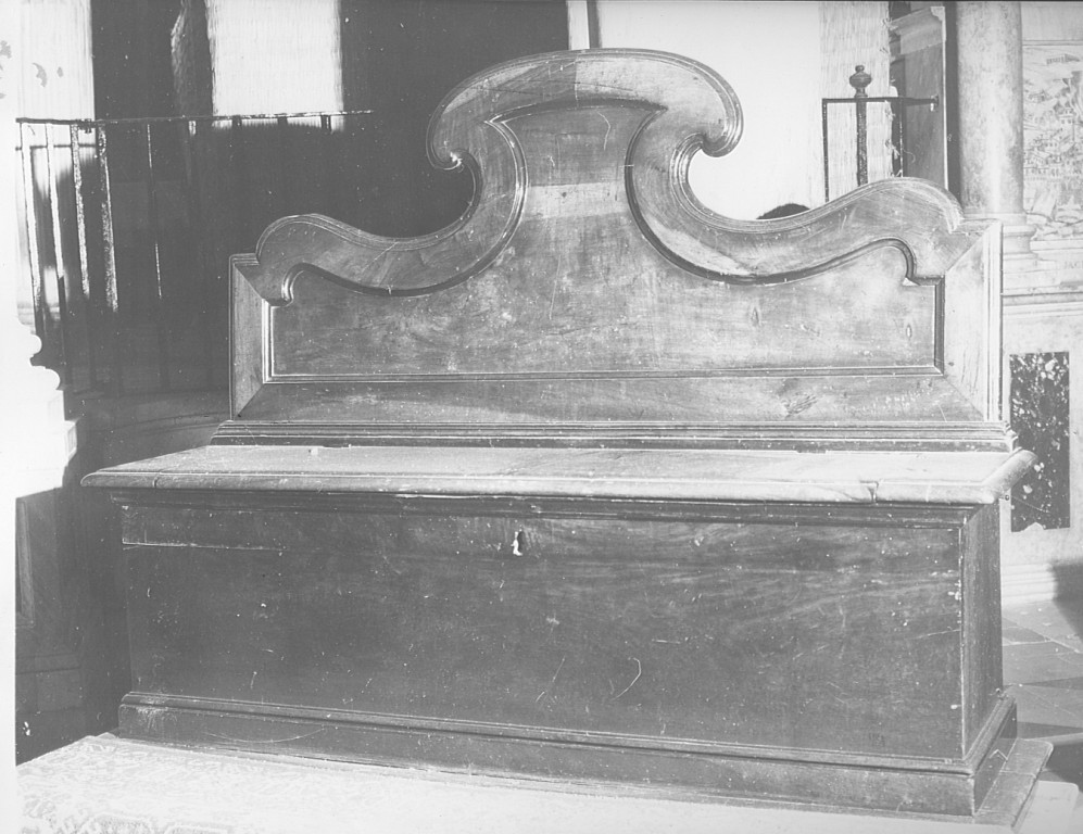 Semplice cassone a forma di parallelepipedo rettangolare con schienale modanato a volute