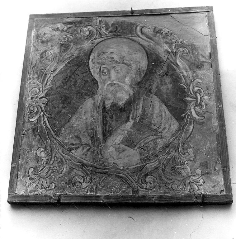 Clipeo decorato da esuberanti elementi foliari. All'nterno, busto di vecchio santo, forse un apostolo. Il viso senile, dall'espressione pensosa, è incorniciato da una barba divisa in due bande. I baffi sono simili a piccole fasce ricadenti. Tra le mani, il santo tiene un libro e una penna