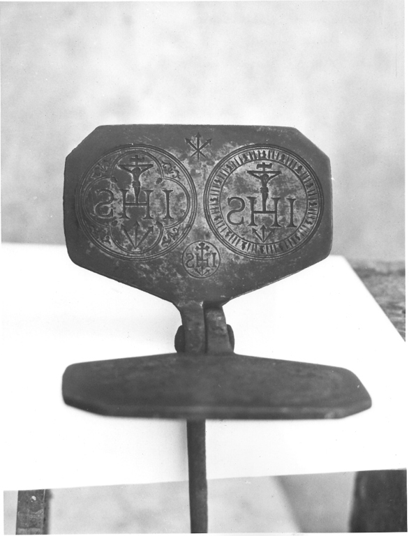 Stampo con lungo manico; all'interno della tenaglia sono quattro cornici circolari con monogrammi e immagini sacre
