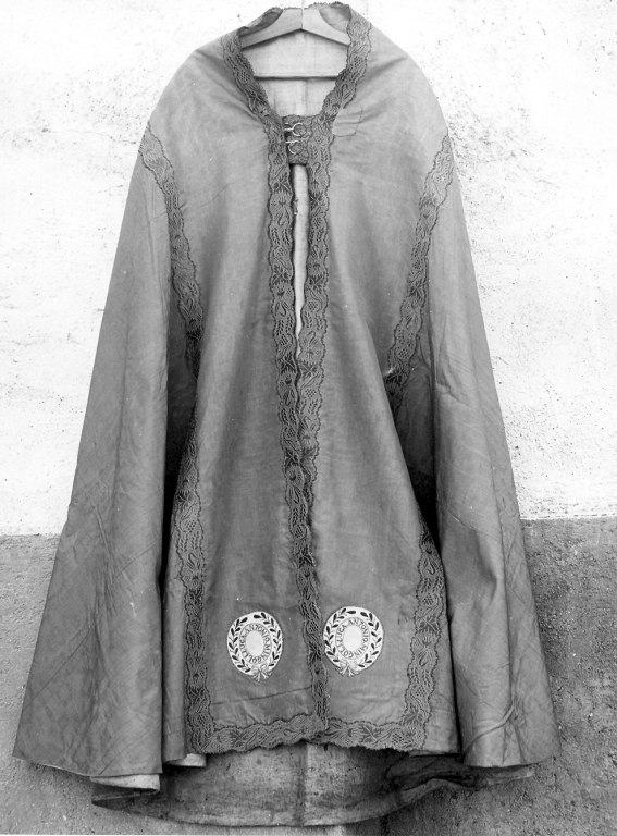 Fondo in "faille" marezzato giallo; bordi ondulati e passamanerie dorate con spighe e tralci di vite