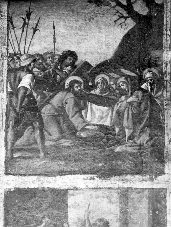 Personaggi: Gesù Cristo; Santa Veronica. Figure: pie donne; soldati; carnefici. Attributi: (Santa Veronica) velo. Oggetti: croce; lance. Piante: alberi