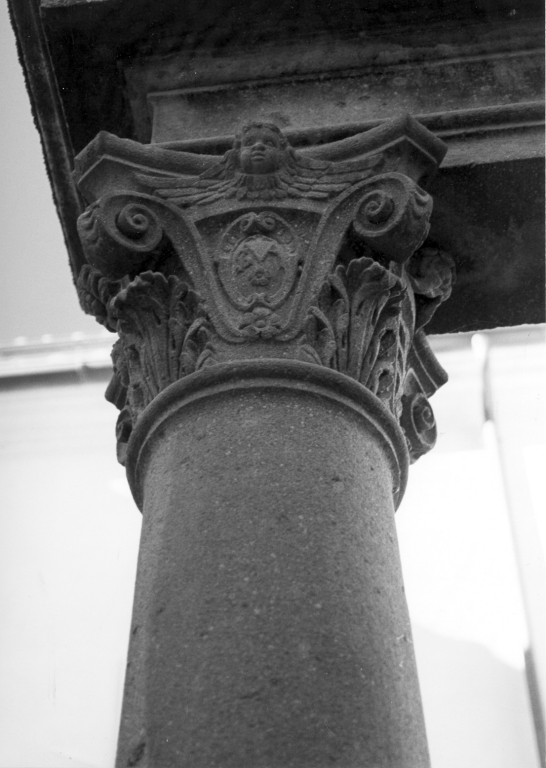 Capitello corinzio con volute angolari che incorniciano stemmi