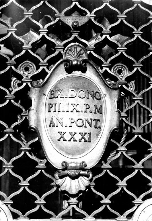 a doppio battente, composto da una cornice ornata da rosette, racchiudente motivo a grata centrato da scudo ovale con stemma pontificio nella parte anteriore e iscrizione nella parte posteriore; alla base due rami di palma incrociati