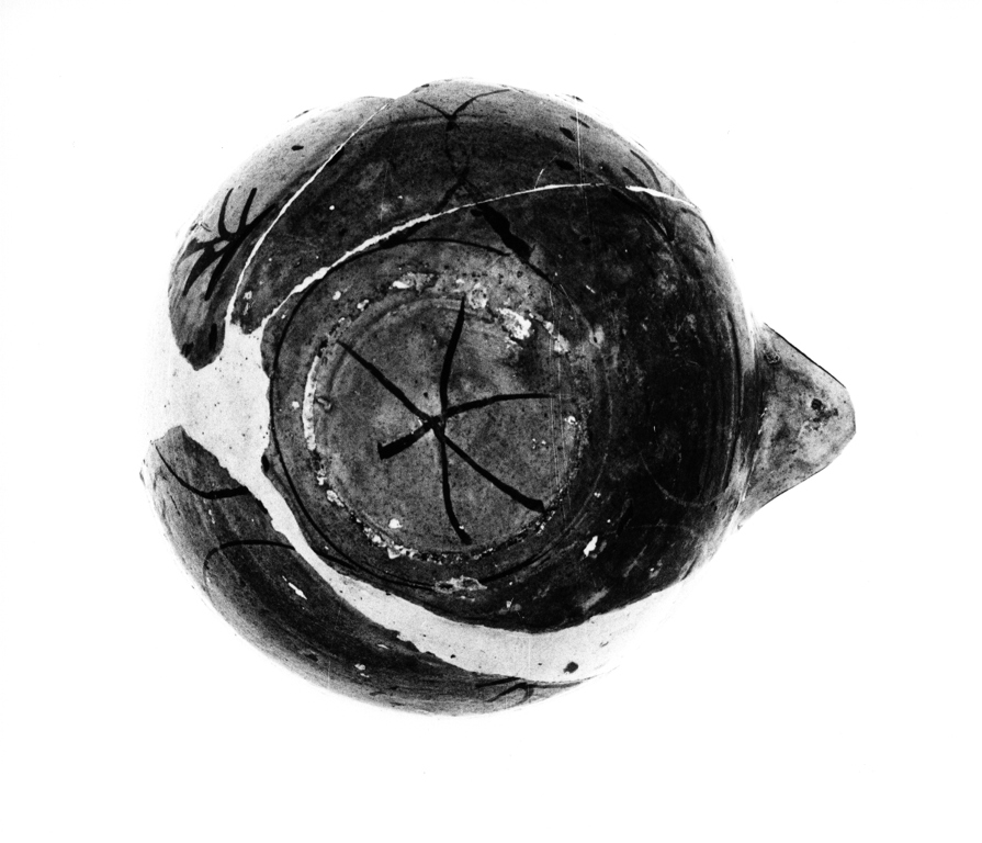 Ciotola semisferica, apoda con anse ad orecchio. Decorazione a lustro e cobalto composta da foglie e fiori stilizzati con al centro un monogramma dacchiuso in un arco. All'esterno palme stilizzate inscritte in circonferenze; nel fondo concavo un asterisco
