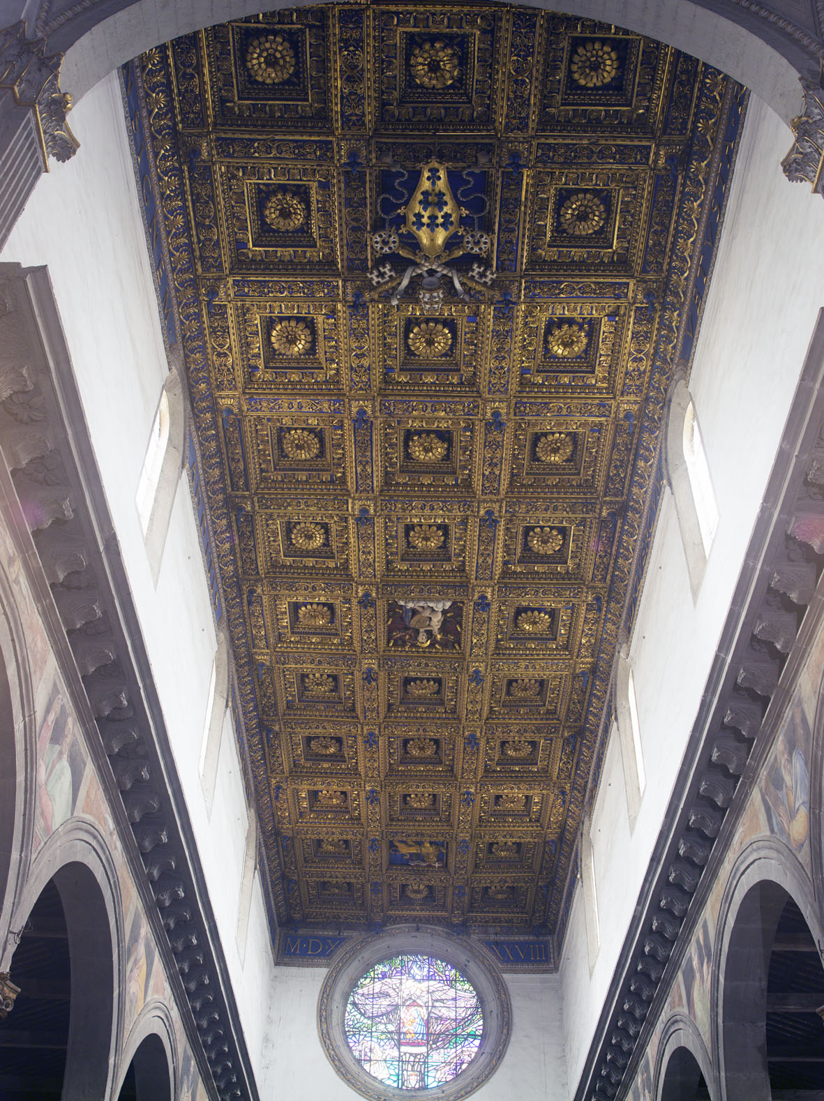Palco a lacunari con rosoni. Al centro, a distanze simmetriche, sono: il leone di Viterbo con la palma, la Madonna della Quercia e lo stemma di papa Paolo III