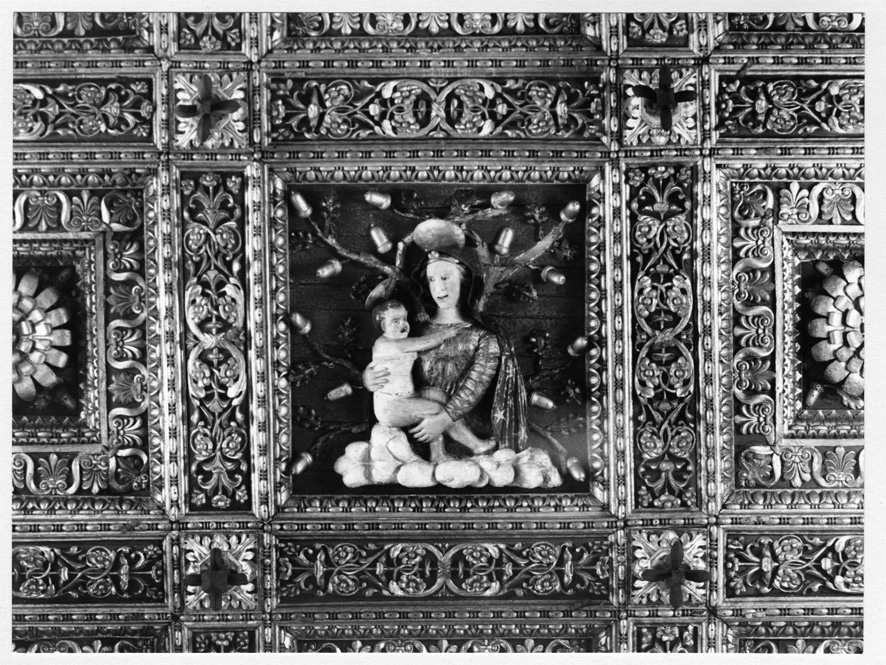 L'esecuzione approssimativa del riquadro tiene ovviamente conto della sua collocazione. La Madonna stringe tra le braccia il Bambino, emergendo da nubi e contornata da ramificazioni stilizzate di quercia, che risaltano sullo sfondo rosso