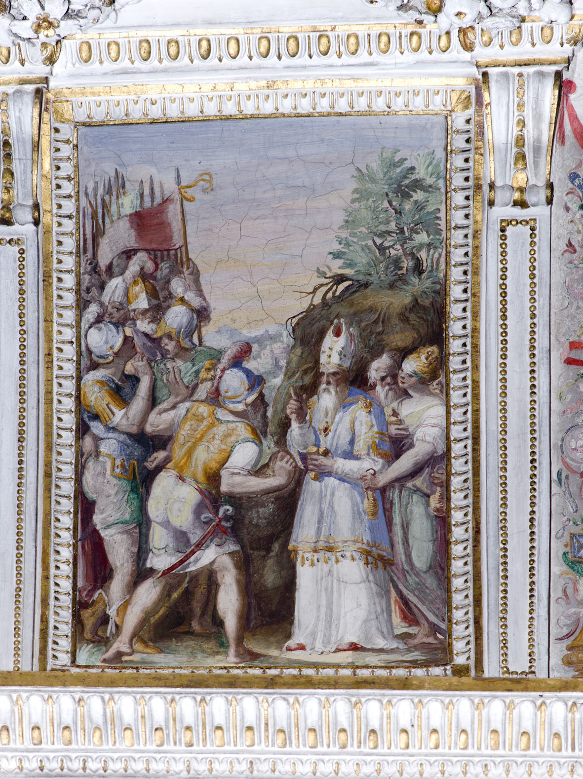Il tema trattato non è ben chiaro tuttavia sulla destra domina la figura di un gran Sacerdote con copricapo bianco e due punte, che ha in mano dei piccoli sacchetti, e con gesto ammonitore si rivolge ad un soldato, di spalle, che si ritrae, quasi a scusarsi, mentre dietro di lui, i compagni a schiera parlano tra di loro
