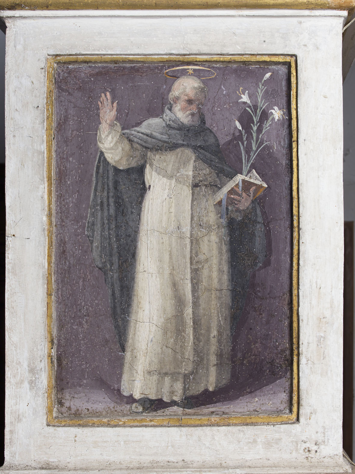 Il Santo con il braccio destro leggermente sollevato sembra leggere ispirato; tradizionalmente rappresentato con folta barba quando completamente biondo, come qui, quando scuro. Ha nella mano sinistra un libro e dei gigli bianchi