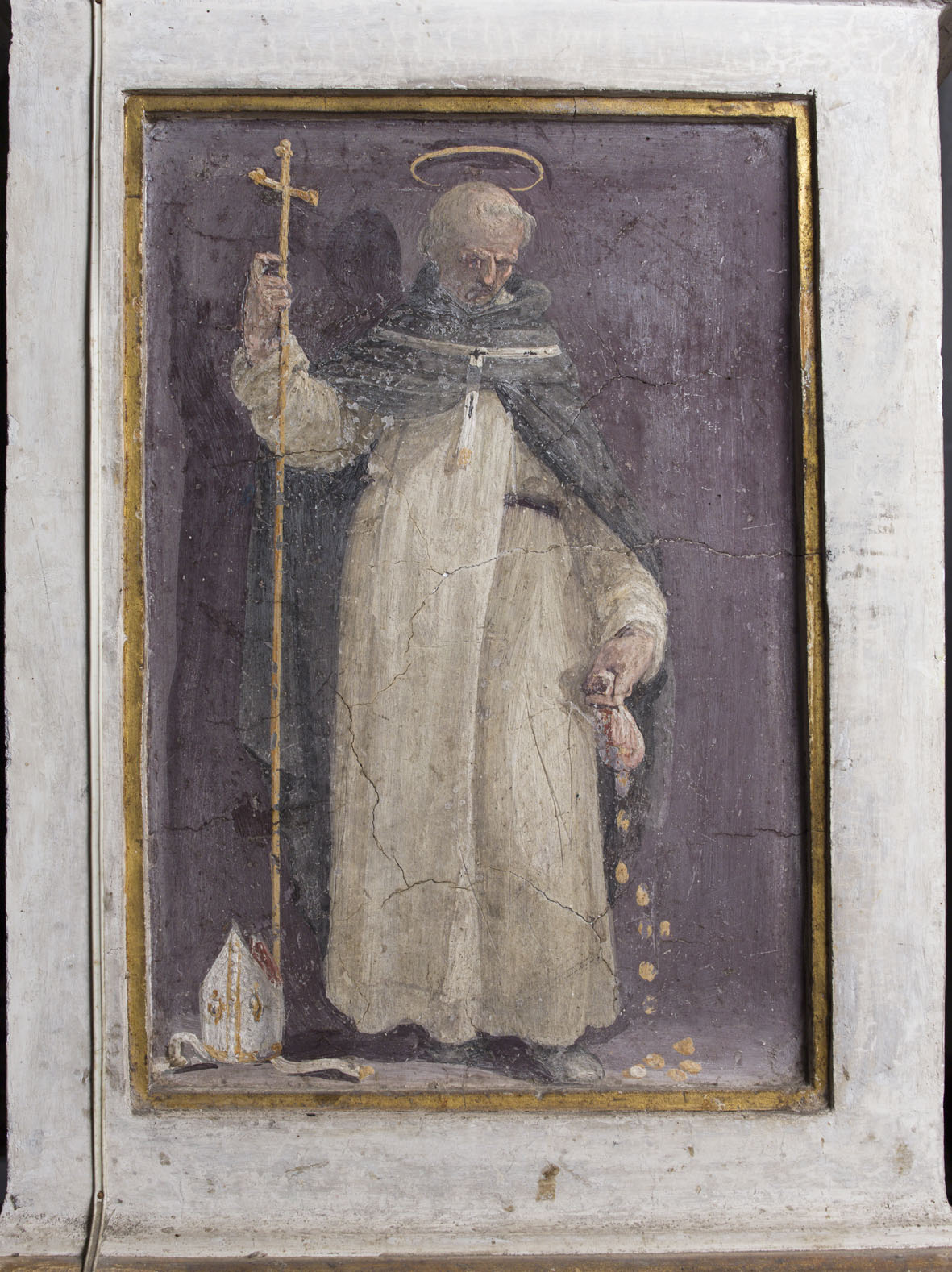 Il Santo è qui rappresentato in abiti vescovili e relativi paramenti; ai suoi piedi c'è la mitra e nella mano destra tiene stretto un alto crocifisso processionale mentre a capo chino guarda il sacchetto che gli pende dalla mano e dal quale cadono delle monete