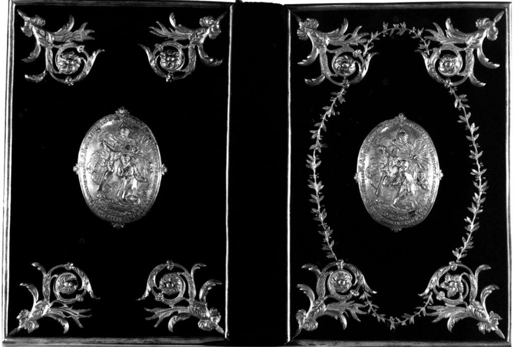 La coperta è decorata agli angoli con un motivo a girali vegetali applicati. Al centro di entrambi i lati vi è applicata una formella d'argento sbalzato di forma ovale