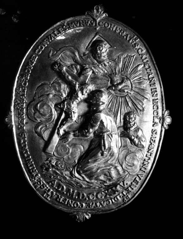- ISCRIZIONI intorno ai medaglioni - CONFRAT. IS S. CAIETANI ECCLESA S. FANTINI VENET.RU DICATAE CONFRAT.IS SS.MAE TRINITATIS PEREG.RU: AL.AE: C.ES ROMAE CONVALES MUNUS/ AD. M. D. CCXXV - lettere capitali - a rilievo -