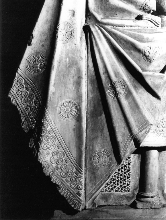 sarcofago decorato con colonnine alternate a lastre a decorazione musiva di tipo cosmatesco, coperto da un drappo decorato con motivi floreali inclusi in figure geometriche. Figura intera sdraiata del defunto vestito con abiti cardinalizi