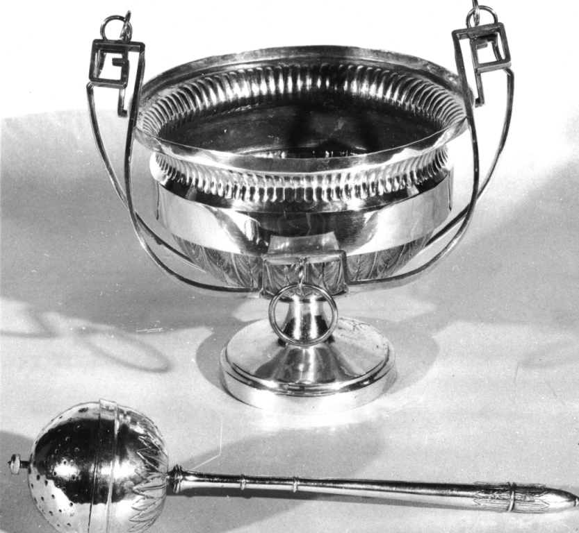 Servizio per aspersione con secchiello ornato nella coppa da motivo fogliaceo e con bordo baccellato; manico con terminazione squadrata. Aspersorio con simile decorazione fogliacea nel bulbo e nel manico