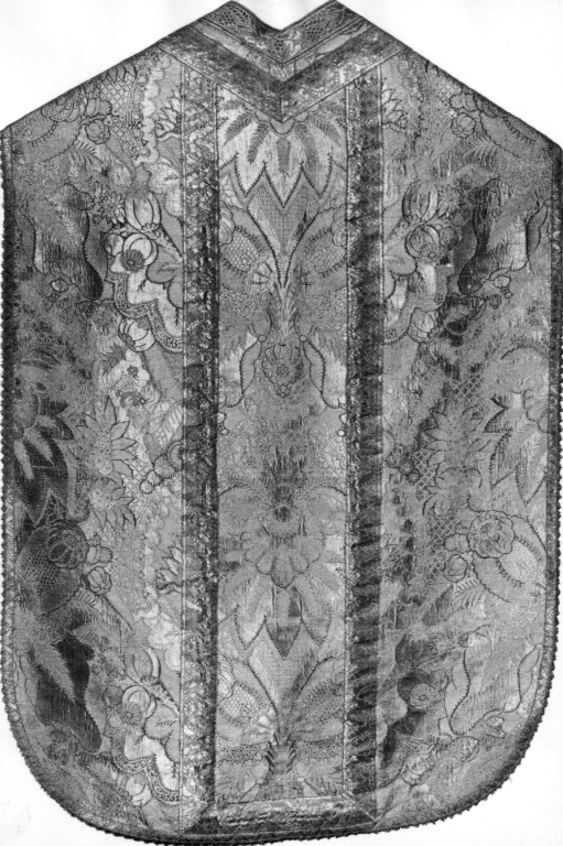Pianeta in broccato d'oro con ricamo con fiori e foglie di melograno e glicini di colore blu e rosso sfumati
