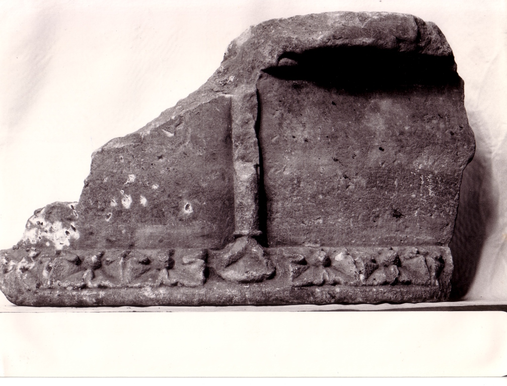 Il frammento di rilievo è decorato da una colonnina con capitello ed un fregio con motivi vegetali di fiori a quattro petali orna il bordo superiore