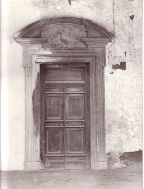 Porta inquadrata da cornici rettilinee e coronata da una lunetta semicircolare al centro della quale è scolpita la colomba col ramoscello d'ulivo