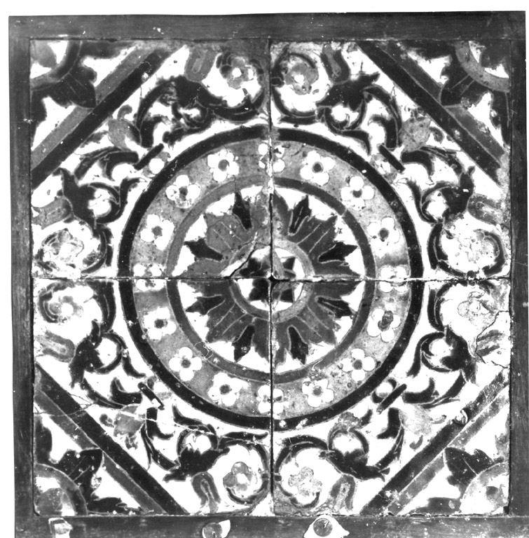 Mattonella decorata in cobalto, ferraccia, manganese e ramina in modo da formare, composta in un gruppo di quattro, un rosone centrale a stella inscritto in una fascia circolare con 16 fiorellini stilizzati, attorno alla quale corre un motivo a volute fitomorfe. Un angolo è tagliato da una doppia fascia (che in combinazione di quattro mattonelle forma un rombo) e contiene un elemento floreale