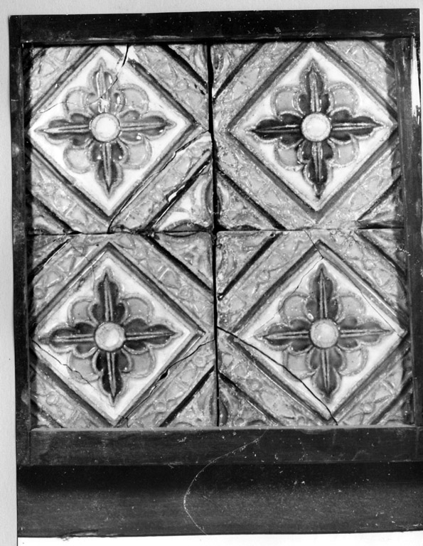 Mattonella decorata in cobalto, ferraccia, manganese e ramina con un rombo contenente un fiore con quattro petali lobati