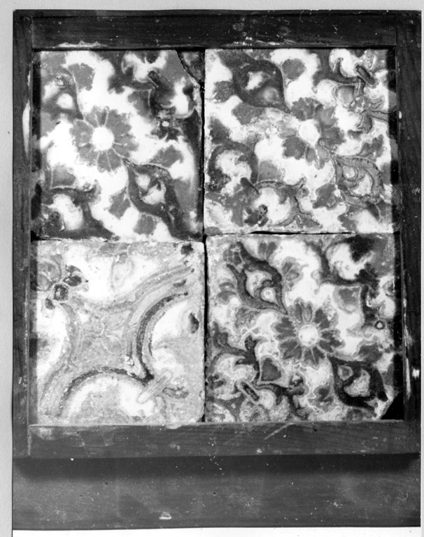 Mattonella decorata in cobalto, ferraccia, manganese e ramina con motivi floreali ricorrenti disposti in diagonale