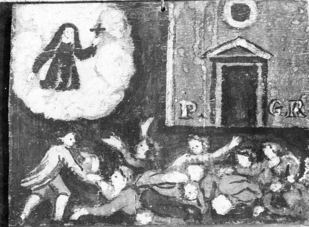 Personaggi: Santa Rosa. Attributi: (Santa Rosa) crocifisso. Figure femminili. Figure maschili. Architetture: edificio