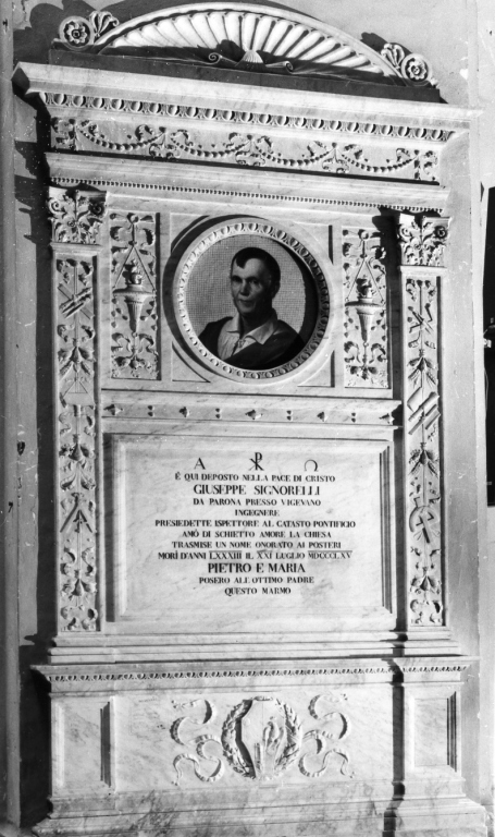 su alto basamento liscio con cornice ad ovoli nella parte superiore, al centro del quale è posto lo stemma gentilizio. Ai lati sporgono plinti di semipilastrini decorati in bassorilievo con mazzetti di frutti e spighe intervallati da strumenti di precisione (goniometri e compassi) e sormontati da capitelli. Ilriquadro centrale è diviso in due parti, quella inferiore con la lapide con cornice a rilievo e scritta, la superiore con cornice ed ovale centrale con ritratto del defunto su fonto dorato imitante mosaico, ai lati del quale, con la stessa decorazione dei pilastrini, sono due lanterne votive. Trabeazione con doppia cornice, di cui la superiore sporgente con decorazioni a ovoli, fascia intermedia con nastri e perle; valva di conchiglia con rosette ai lati
