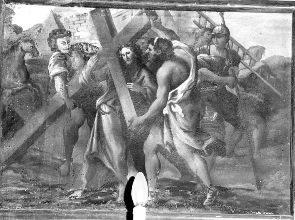 - NOTIZIE STORICO CRITICHE I committenti delle tele della Via Crucis furono coloro che favorirono a loro spese la ricostruzione della chiesa. I duri contrasti chiaroscurali, la piattezza della stesura cromatica, le proporzioni arbitrarie delle figure e l'enfasi dei loro gesti rivelano la mano di un modesto artista locale, ingenuamente ispirato ai modelli della tradizione pittorica precedente