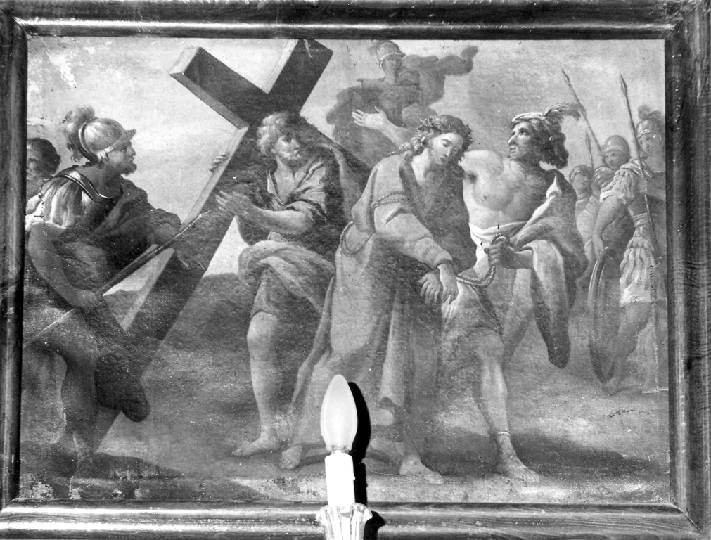 Personaggi: Gesù Cristo; Simone il Cireneo. Figure: carnefice; soldati. Attributi: (Gesù Cristo) corona di spine. Oggetti: croce; lance; spade; scudo. Animali: cavallo