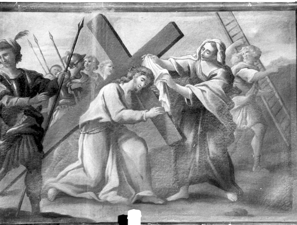 Personaggi: Gesù Cristo; Veronica. Figure: soldati; carnefici. Attributi: (Gesù Cristo) corona di spine. Attributi: (Veronica) panno. Oggetti: croce; lance; scala